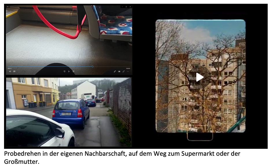 Zunächst lernen wir in der Arbeitsgruppe ‚Film‘ das praktische Handwerk. Dabei haben wir Videokonzeptideen in Textform entwickelt. Wir haben überlegt, was sich in der Zukunft geändert haben könnte und was wir uns von der Zukunft erhoffen. Dazu unternahmen wir kleine Videoversuche in der direkten Umgebung des Wohnortes.